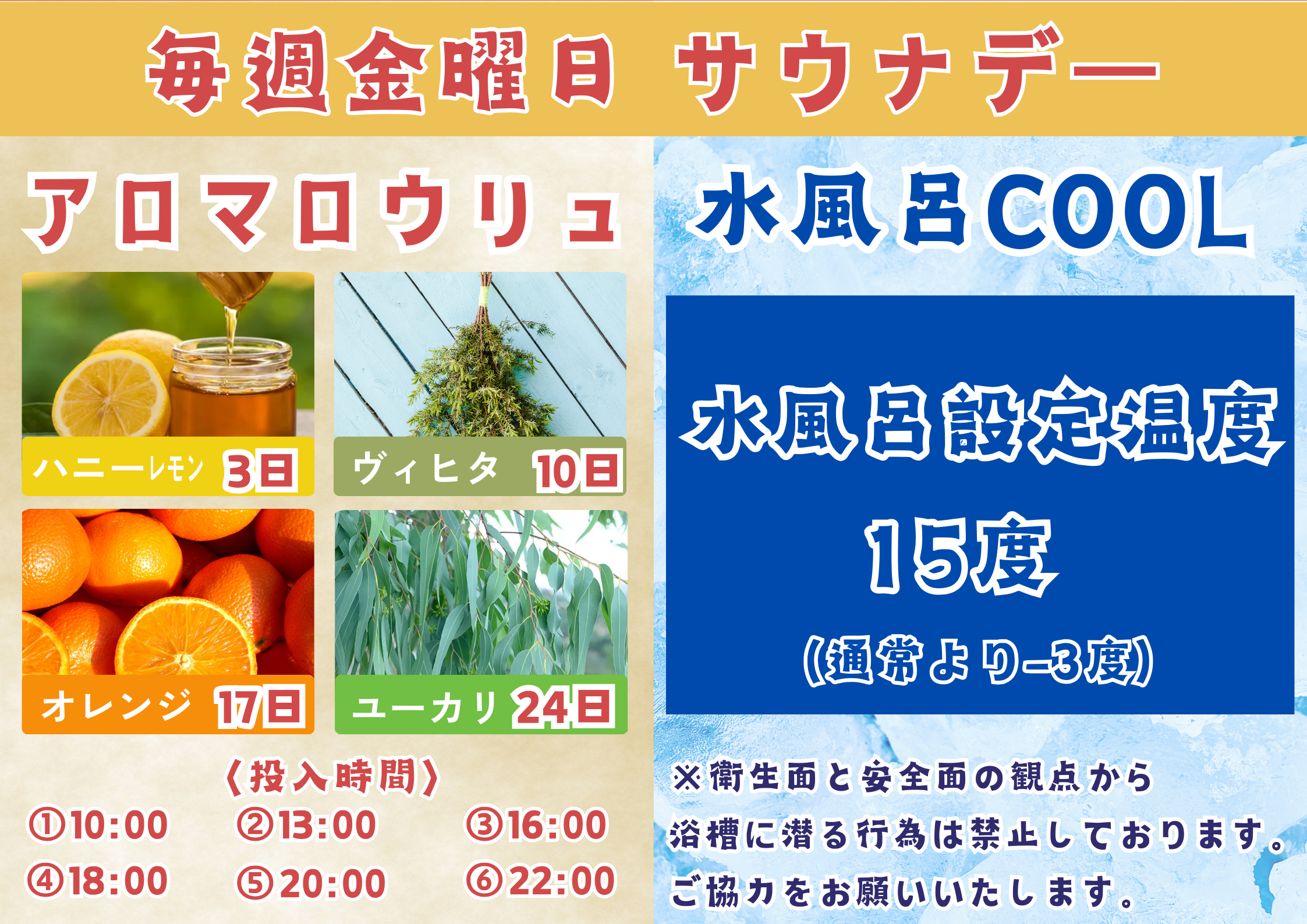 通常18℃の水風呂を、金曜日のみ 15℃へと設定いたします。