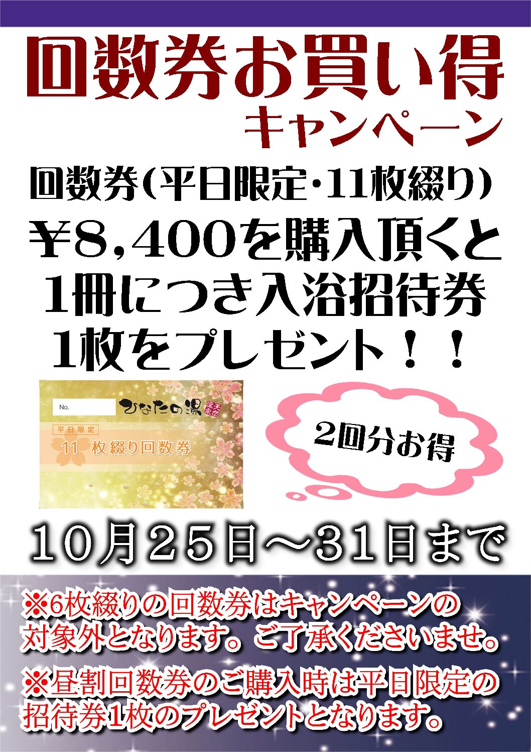 期間中、入浴回数券(平日限定・11枚綴り)のお買い上げ1冊毎に当店の入浴招待券を1枚プレゼント♪