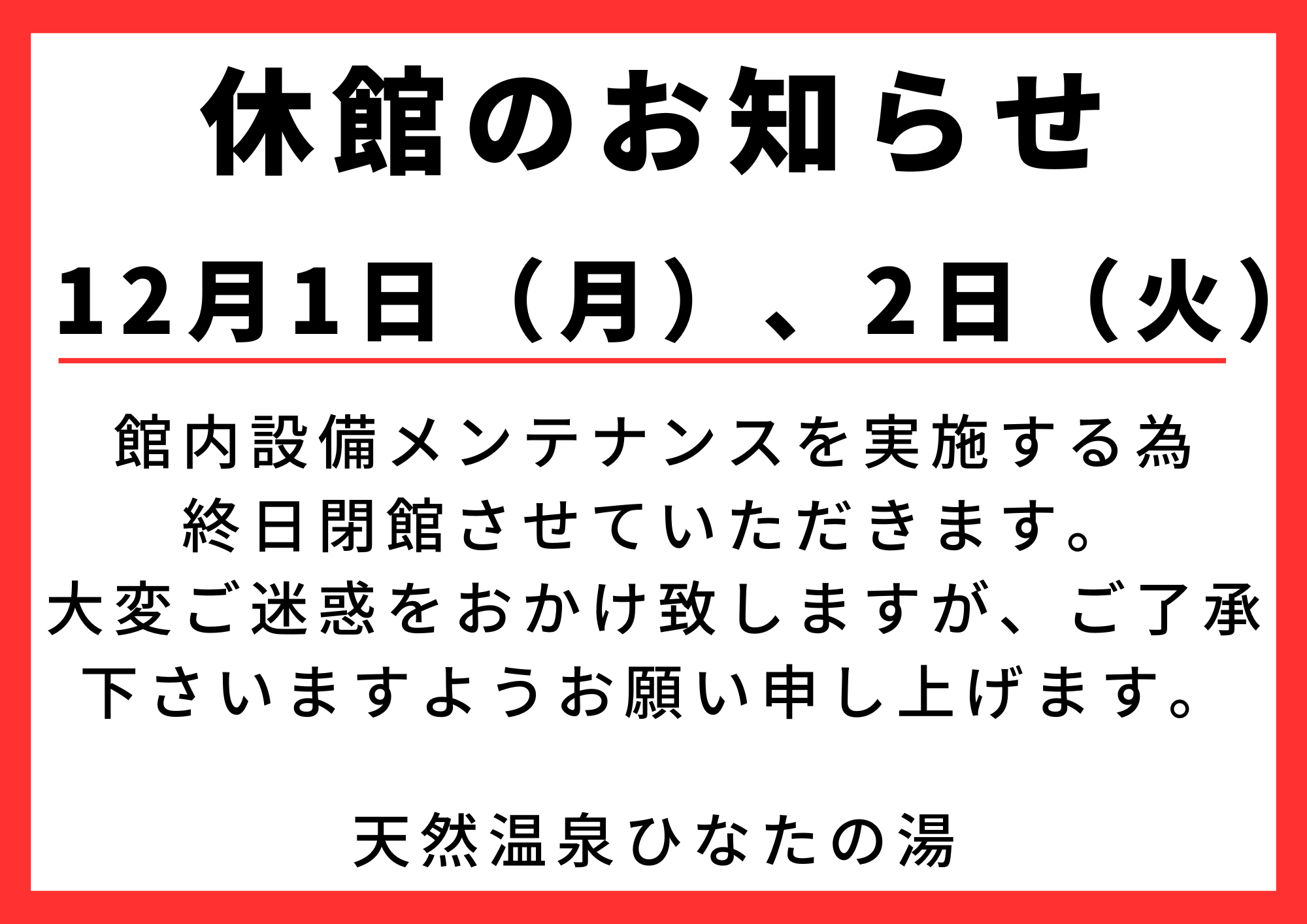 2025.11.01 お知らせ 【12月1日・2日】休館日のお知らせ 平素より当店をご愛顧いただき、誠にありがとうございます。 12月に予定しております設備メンテナンスの為の 休館日についてご案内させていただきます。 休館日日時:12月1日・2日 終日 (12月3日 6:00より通常営業を再開いたします。) 大変ご迷惑をおかけしますが何卒ご理解の程、宜しくお願い申し上げます。 天然温泉ひなたの湯 シェアする ツイートする LINEで送る 前へ 一覧に戻る