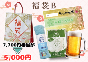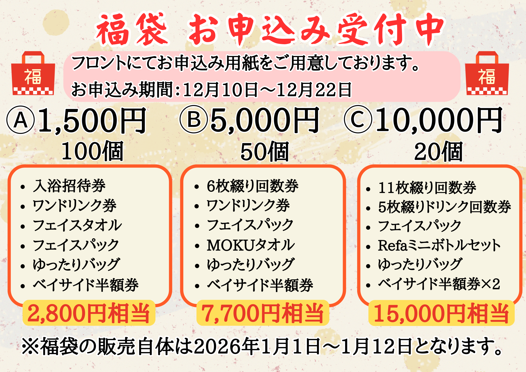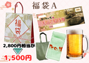 福袋A ¥1,500 ・・入浴招待券、ワンドリンク券、フェイスタオル、フェイスパック他