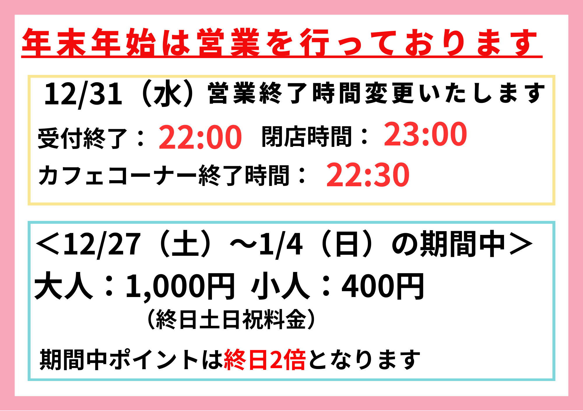 2025.12.24 お知らせ 【年末年始の営業に関して】 〇12月31日の営業終了時間が変更となっております。 受付終了 0:00 → 22:00 閉店時間 1:00 → 23:00 〇12月27日(土)~1月4日(日)は土日祝料金となります。 大人 1,000円 小人 400円 シェアする ツイートする LINEで送る 前へ 一覧に戻る 次へ