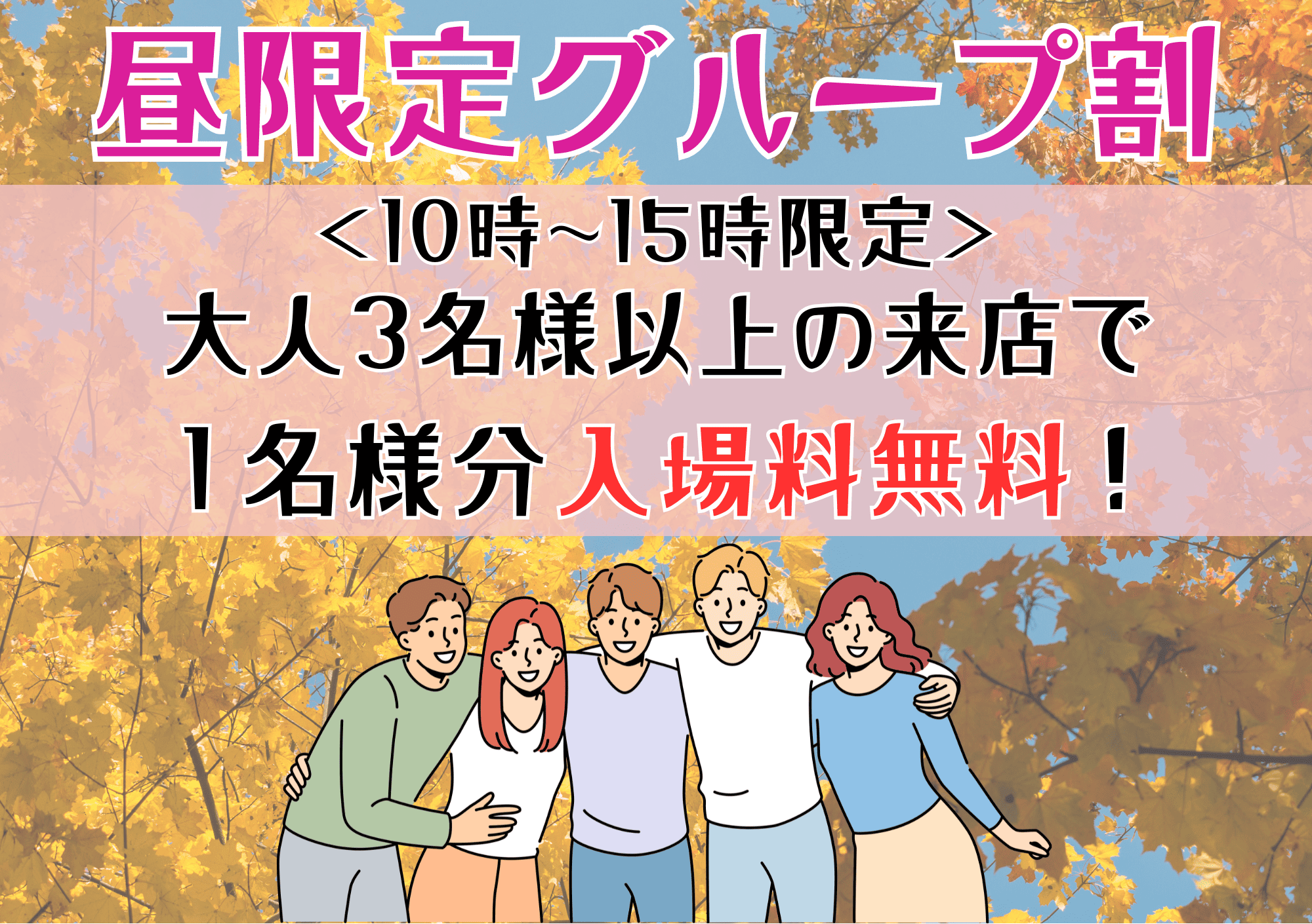 期間中、大人3名様以上のご来店で1名様の入場料を無料とさせていただきます!